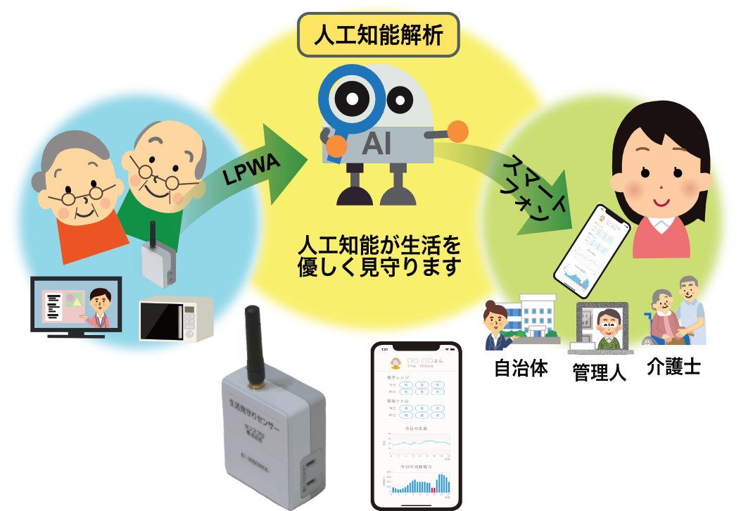 IoT技術は遠隔者同士を結びつける強い味方です。当社は、IoT技術を活用して生活見守りシステムを開発しました。このシステムを利用し、低料金でのサービス導入を始めています。